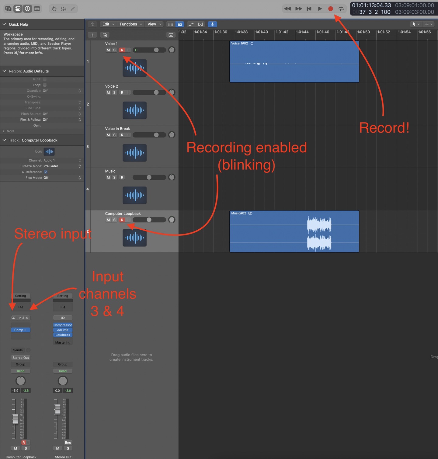 - Input 3 & 4 to a new stereo channel to capture your computer audio via loopback
