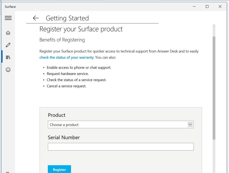 At first blush, the purpose of the app is to introduce you to the Surface's features, process device registration, solicit customer feedback, and so forth. The first thing the app asks of its users is to register the Surface device for benefits that include both requesting (and cancelling!) hardware service. Since part of my aforementioned experiment is to begrudgingly click "yes" to every asanine pop-up and prompt the operating system throws at me, I decided to go ahead and register the device.