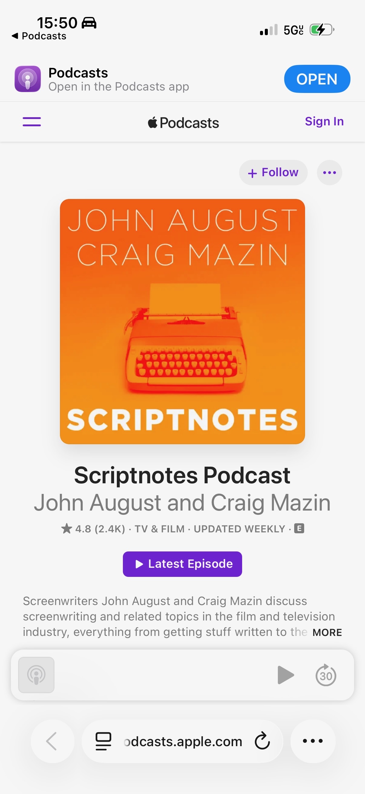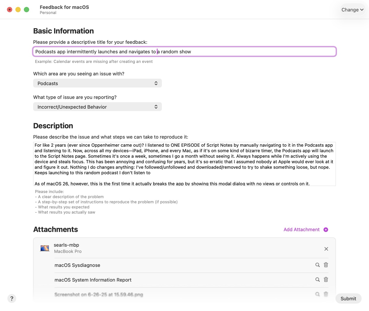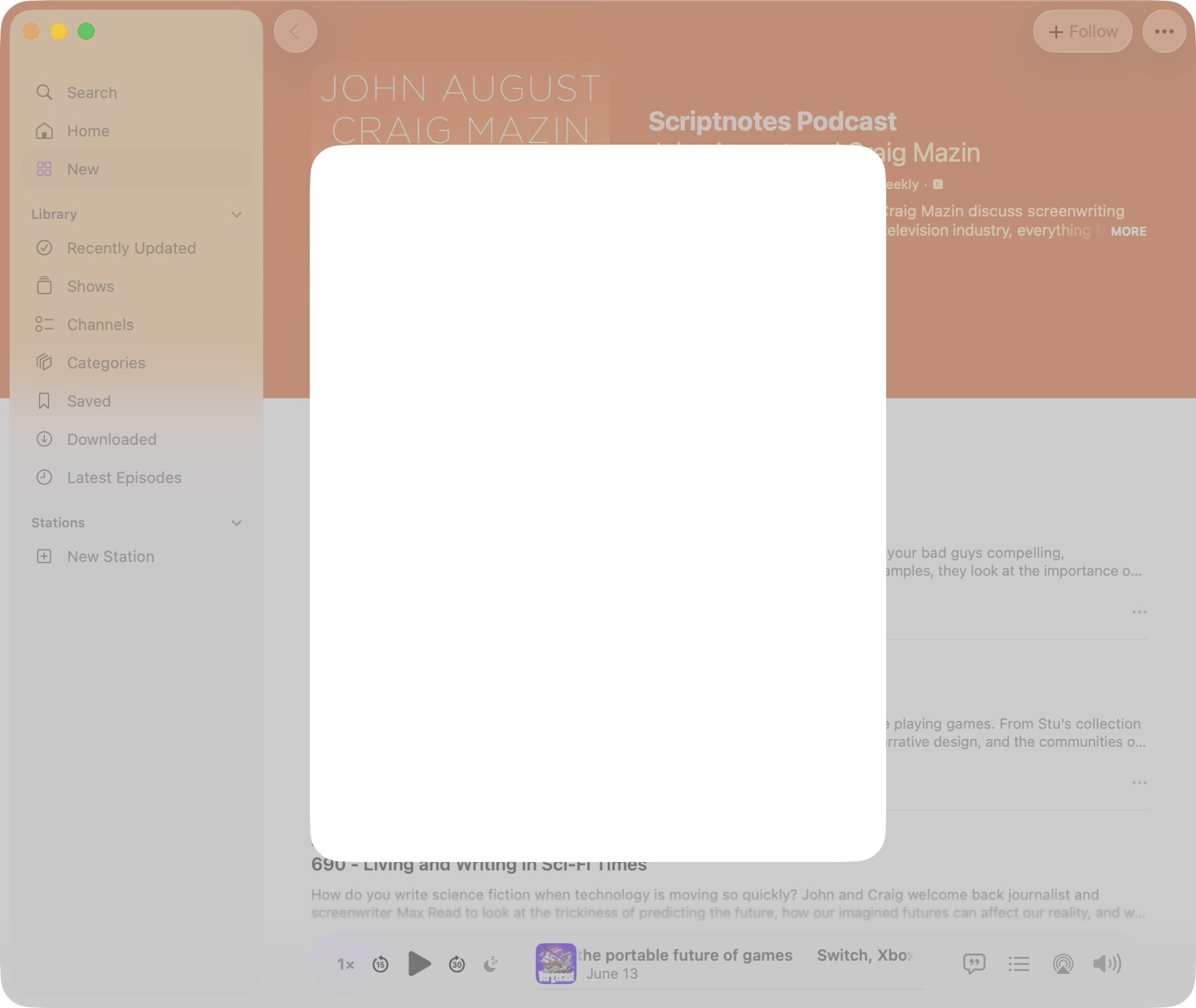 For like 2 years (ever since Oppenheimer came out)? I listened to ONE EPISODE of Script Notes by manually navigating to it in the Podcasts app and listening to it. Now, across all my devices—iPad, iPhone, and every Mac, as if it's on some kind of bizarre timer, the Podcasts app will launch to the Script Notes page. Sometimes it's once a week, sometimes I go a month without seeing it. Always happens while I'm actively using the device and steals focus. This has been annoying and confusing for years, but it's so erratic that I assumed nobody at Apple would ever look at it and figure it out. Nothing I do changes anything: I've followed/unfollowed and downloaded/removed to try to shake something loose, but nope. Keeps launching to this random podcast I don't listen to