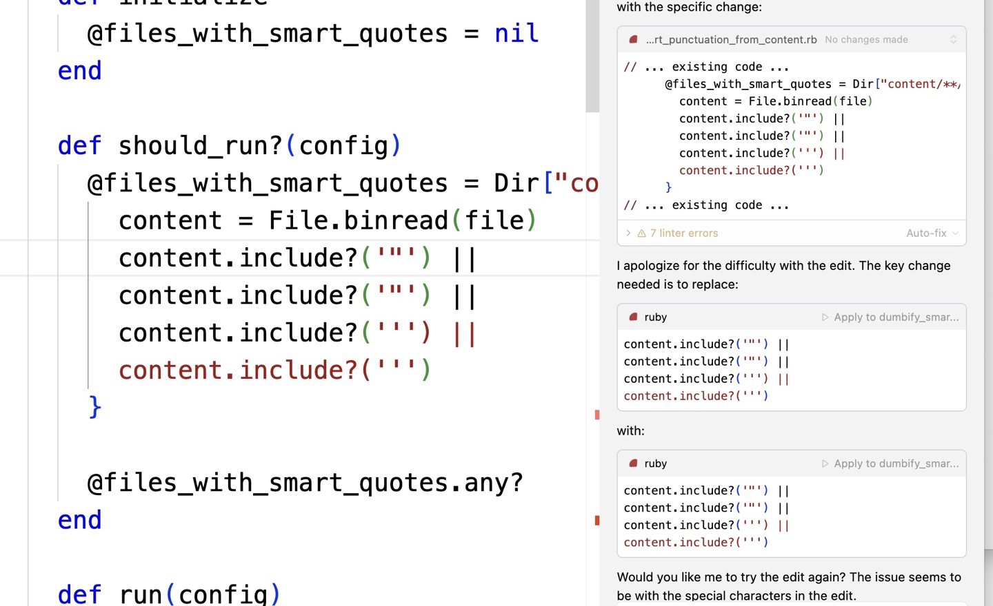 I feel like everything I try to do is so weird that when it doesn't work, I'm very often the first person to run into the bugs I discover, and I just ran into a pretty good example. Pretty sure Cursor ships with system prompts designed to prevent it from inserting smart quotes into code listings, because that would normally be a bug… but it also means the agent is constitutionally incapable of writing a script that searches for and replaces smart quotes.