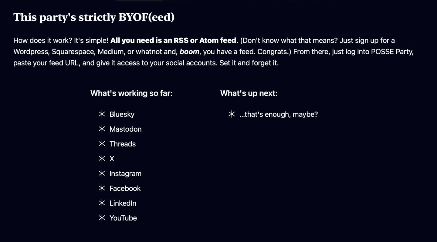Earlier this year, I announced I was working on a Rails app called POSSE Party which allows users to syndicate their website's content to a variety of social platforms simply by reading its RSS/Atom feed.