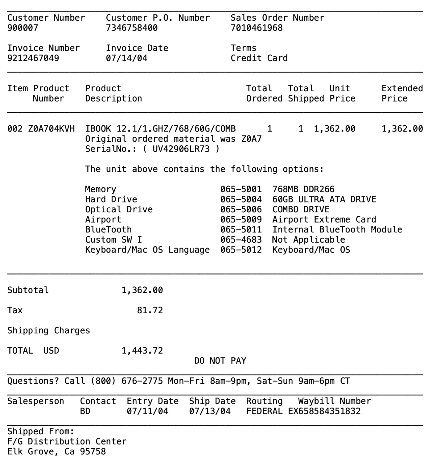 Thanks to a bug in Apple Mail, my Gmail archive likes to revert to sort by ascending date every now and then. Today, I scanned through some of those early emails and stumbled upon this incredible artifact: the e-mail invoice from Apple.com for my first Mac. It was a build-to-order 12" iBook G4 in July 2004.