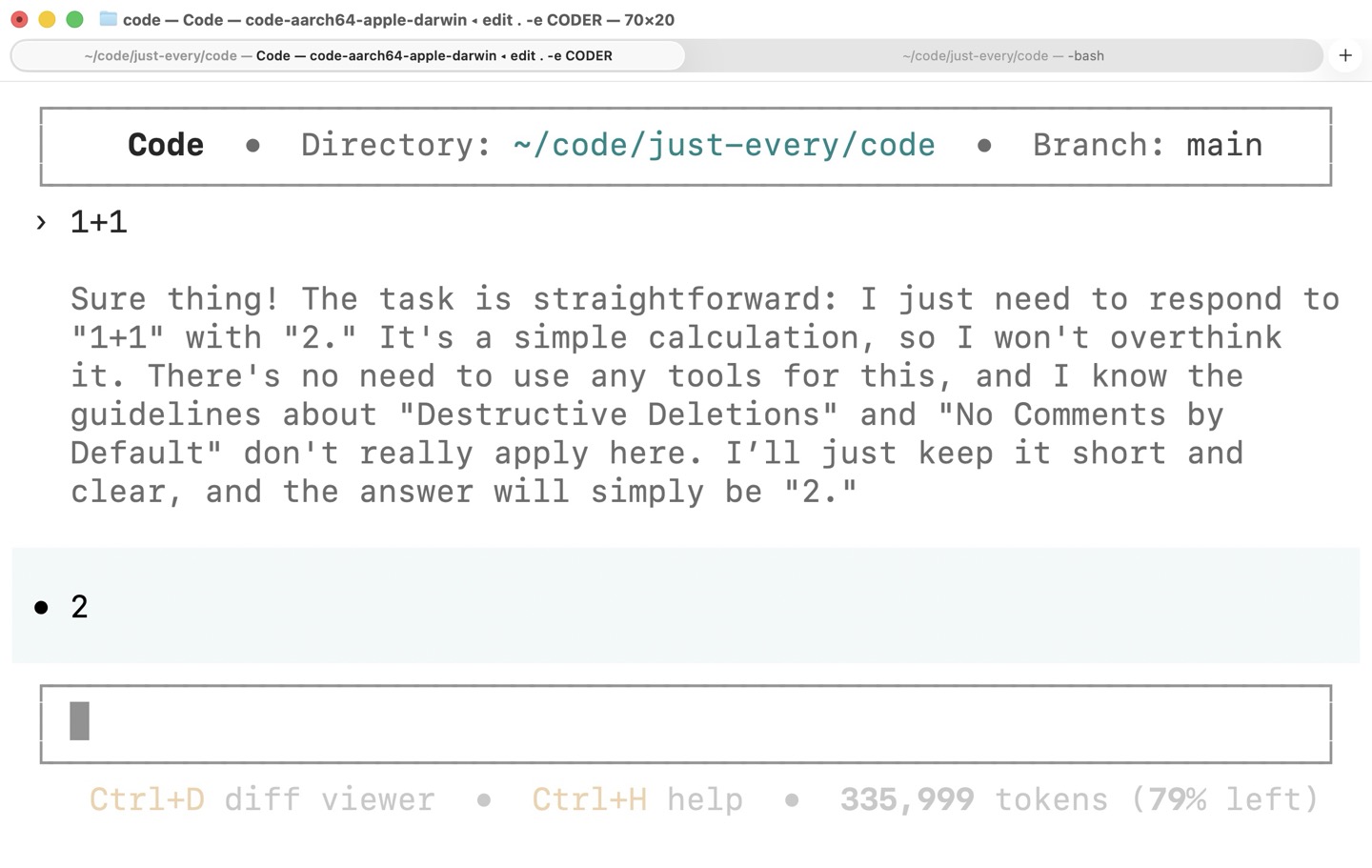Sure thing! The task is straightforward: I just need to respond to "1+1" with "2." It's a simple calculation, so I won't overthink it. There's no need to use any tools for this, and I know the guidelines about "Destructive Deletions" and "No Comments by Default" don't really apply here. I'll just keep it short and clear, and the answer will simply be "2."
