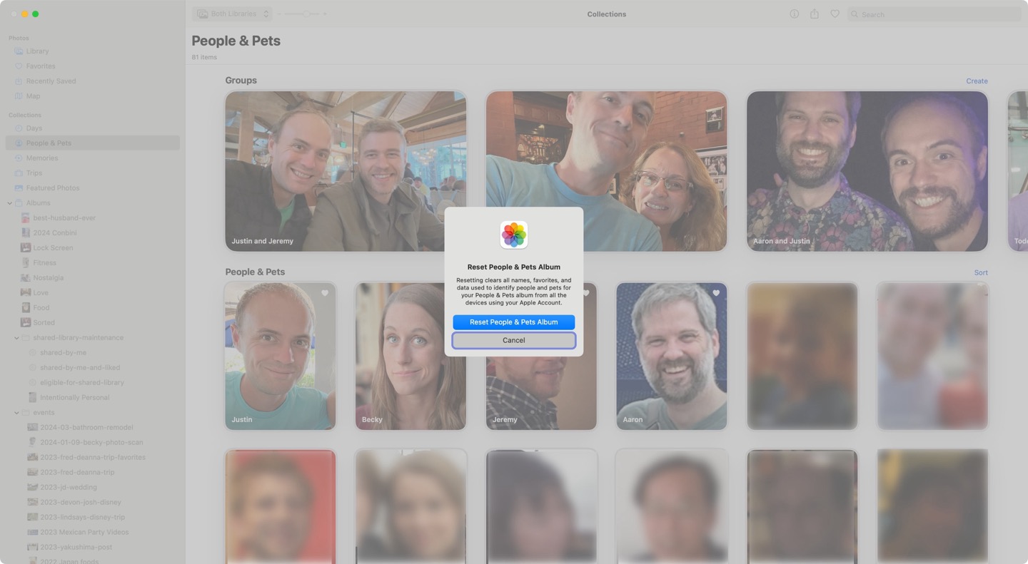 - If absolutely every item is selected a special dialog will appear prompting you to "Reset People & Pets Album". Click it, if you dare