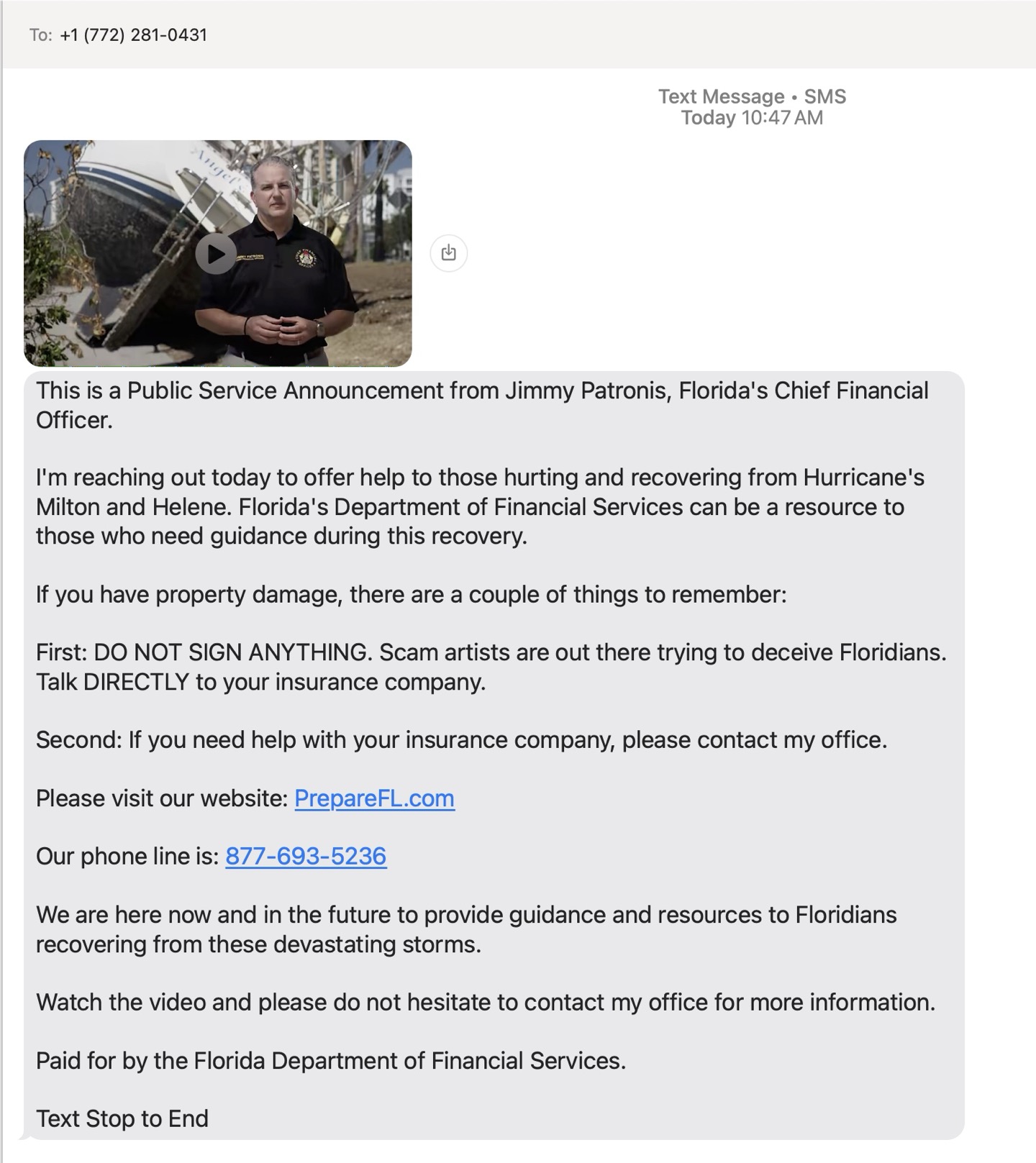 - That homepage indicates Florida really has a "Chief Financial Officer" role (are Florida politicians just LARPing at this point?) and that it matches this guy's name and lists a phone number matching the one in the text message