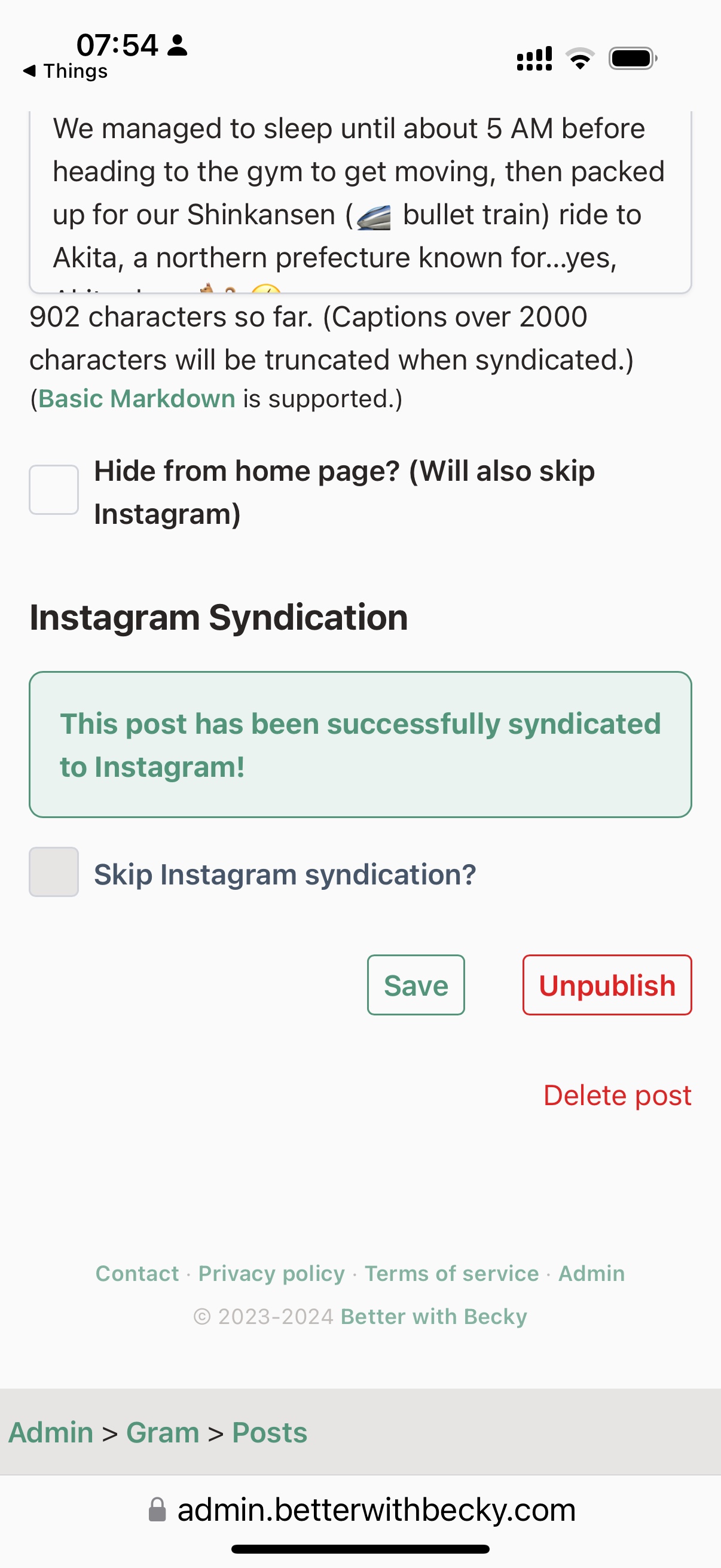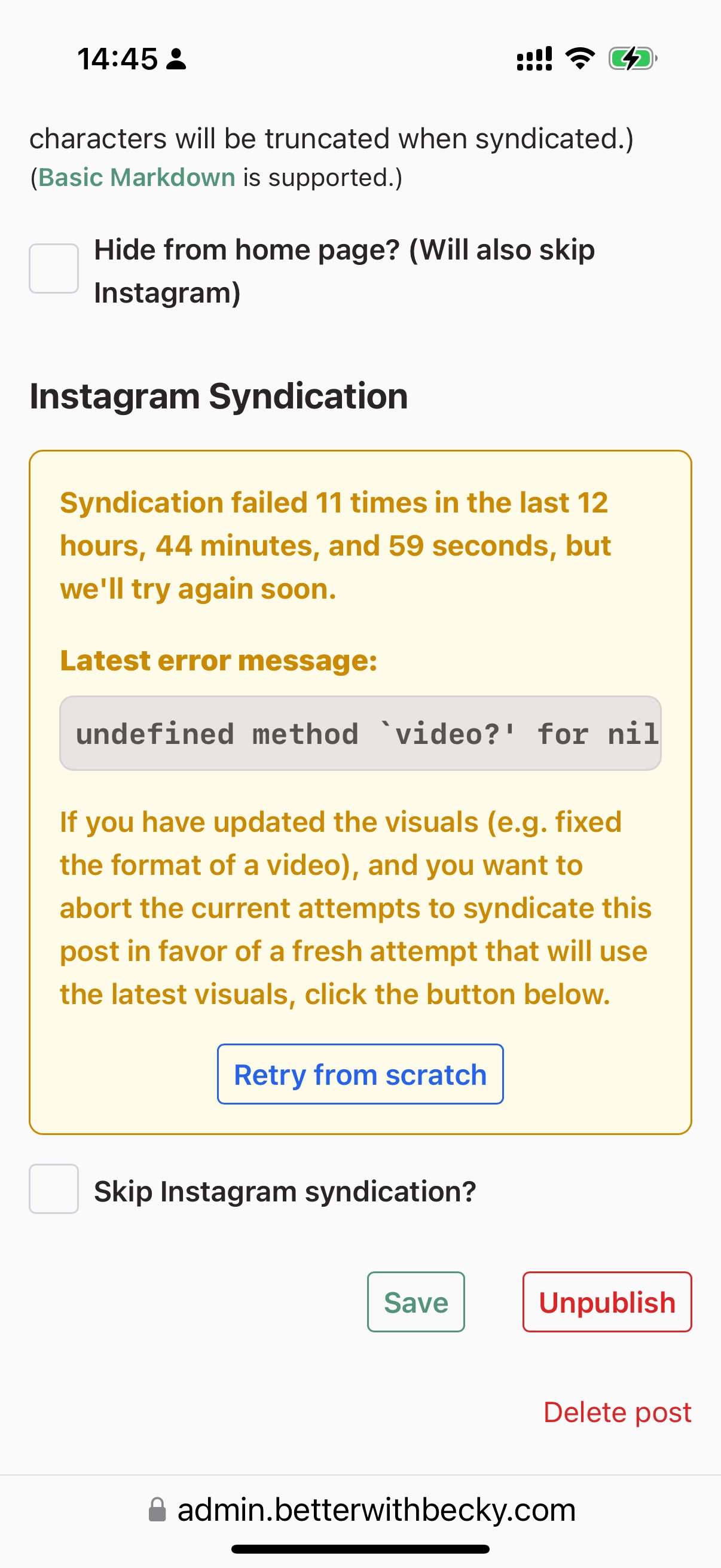 Noticed an issue with Beckygram yesterday where single-video posts weren't successfully syndicating to Instagram as reels if she didn't also upload a custom thumbnail ("cover") image—which Instagram's API doesn't require.